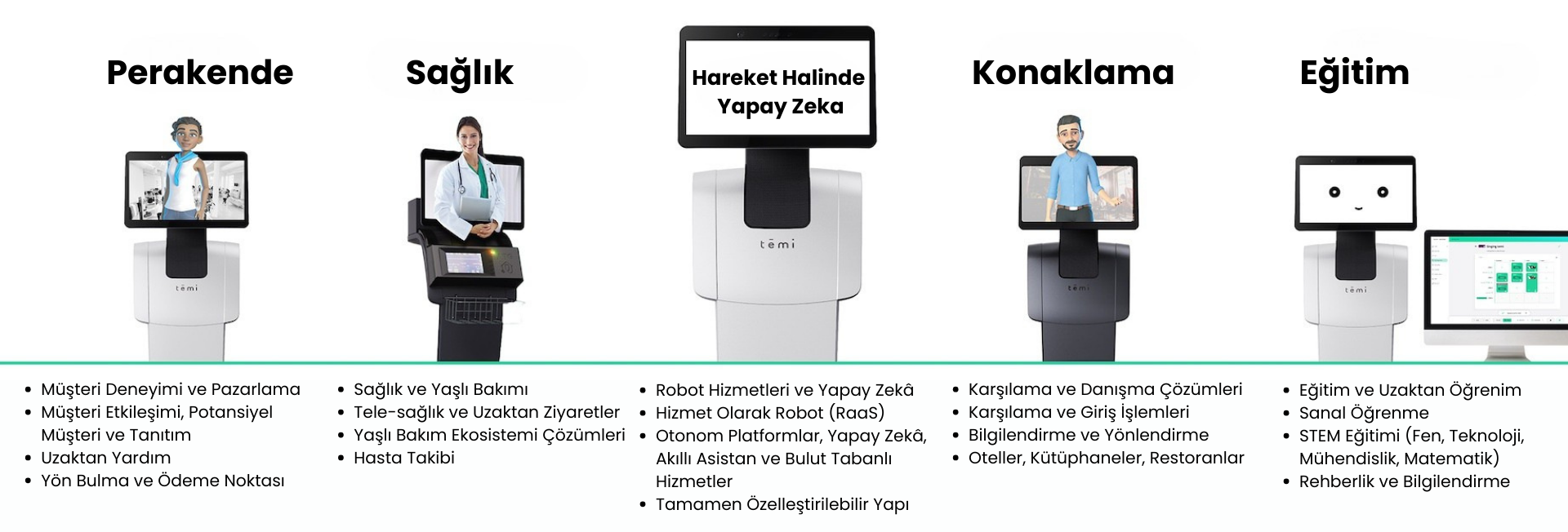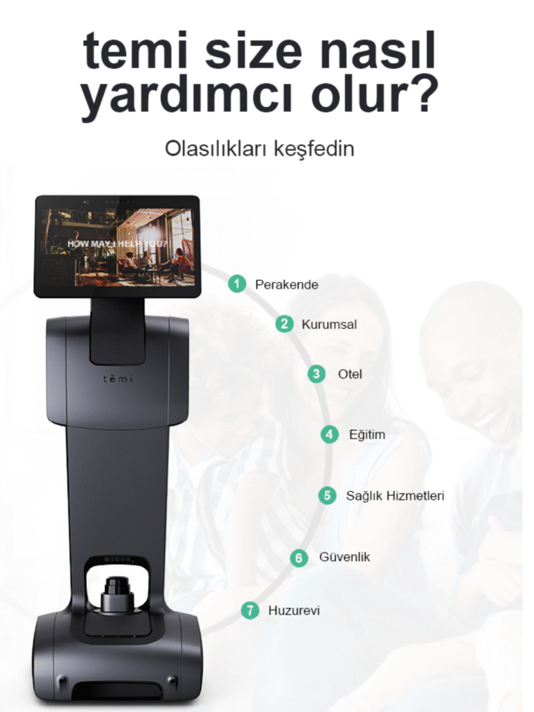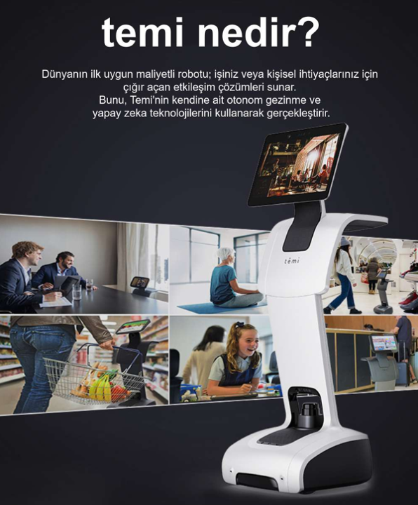 Yeni Nesil Robotik AsistanTemi, dünyanın ilk gerçek anlamda kişisel yapay zekâ destekli mobil robotudur. Kullanıcılarına etkileyici bir etkileşim sunmakla kalmaz, aynı zamanda bulunduğu ortamda akıllı çözümler sunarak hayatı kolaylaştırır. Yüksek teknoloji, şık tasarım ve pratik kullanım deneyimini bir araya getiren Temi; sağlık, eğitim, perakende, konaklama ve ev kullanıcıları için özel çözümler sunmaktadır.